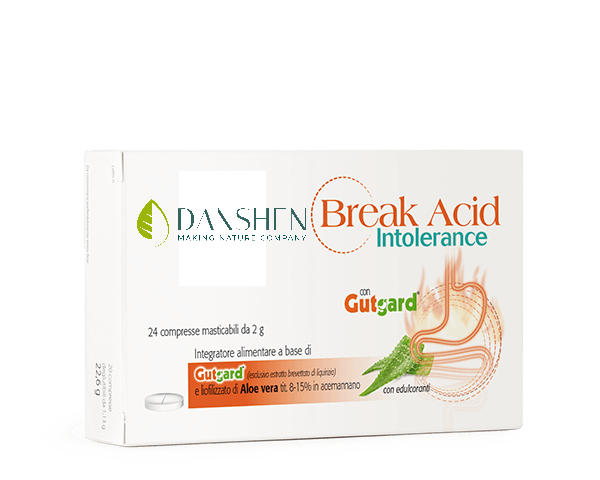 Ingredienti : Edulcorante: Mannitolo, Calcio carbonato, Sodio bicarbonato, Agente antiagglomerante: Sali di magnesio degli acidi grassi, GutGard® (Liquirizia (Glycyrrhiza glabra L., radice) estratto deglicirrizinato) tit. 3,5% in glabridina, 10% in avonoidi totali e max. 0,5% in glicirrizina (liquirizia,
