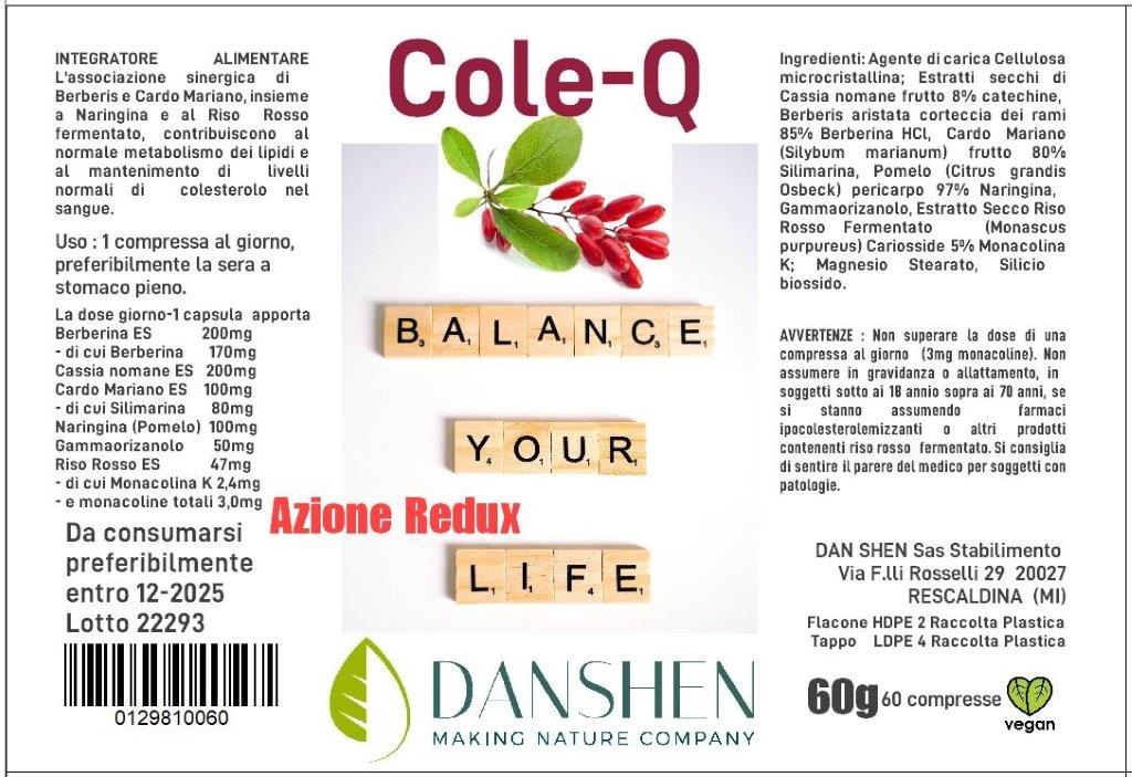Cole Q Azione Redux è un integratore alimentare a base di Berberina, Cardo Mariano, Cassia nomane, Naringina, Gamma orizanolo e Riso rosso fermentato da Monascus purpureus.