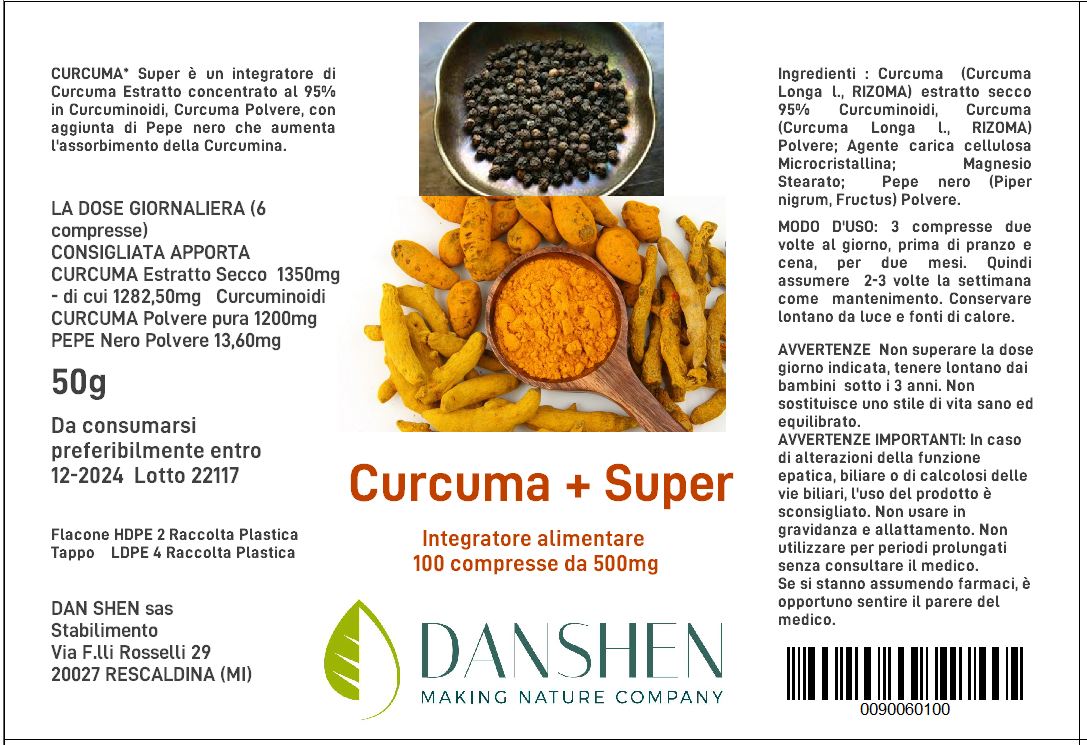 CURCUMA + SUPER è un Integratore alimentare a base di Estratto secco concentrato di Curcuma (Curcuma longa L.), titolato al 95% in Curcuminoidi, miscela di sostanze costituita prevalentemente da curcumina, demetossicurcumina e bisdemetossicurcumina.