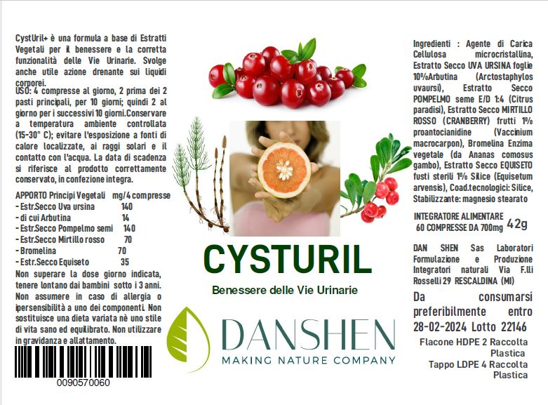 CYSTURIL è un complesso di principi vegetali selezionati per la loro azione benefica sulle vie urinarie. La formula esclusiva contiene estratti secchi concentrati e titolati di Uva ursina, Mirtillo rosso, semi di Pompelmo, Equiseto, uniti alla Bromelina, enzima estratto dai gambi verdi dell’Ananas.