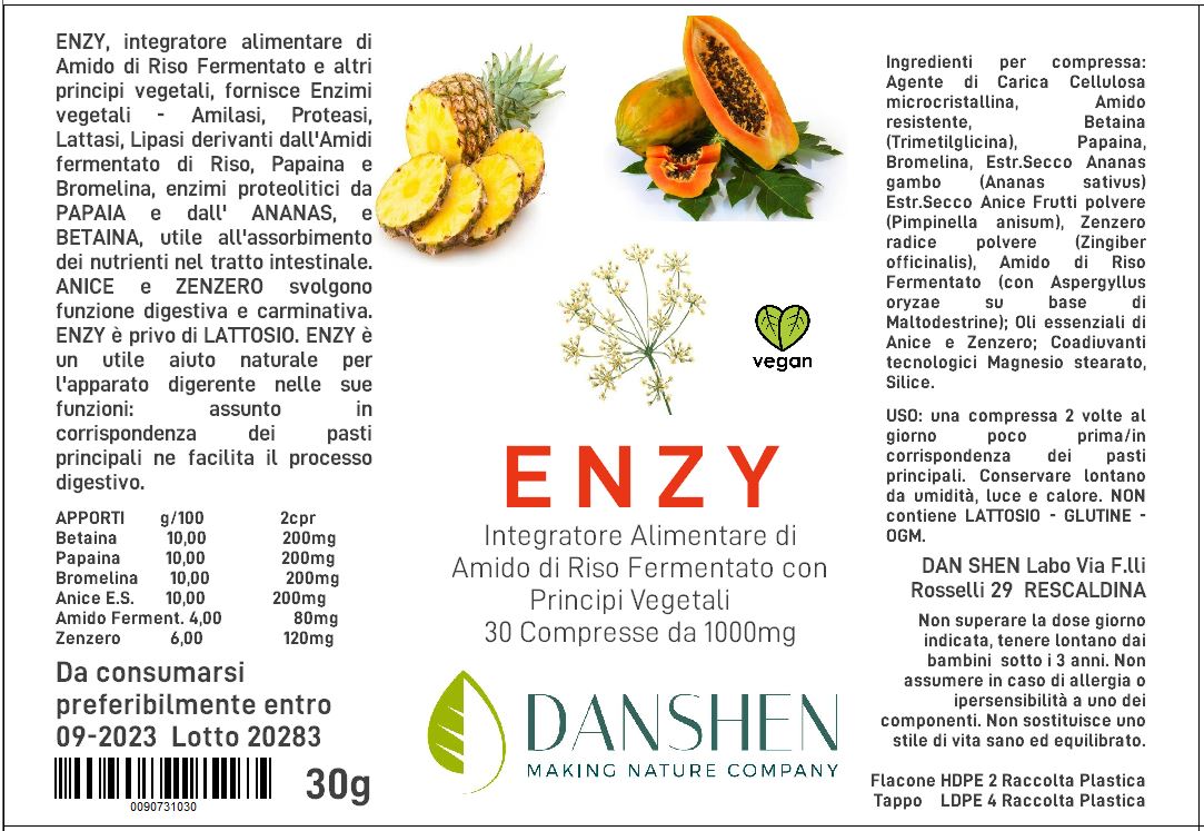ENZY è un integratore alimentare che granzie alla formulazione a base di Amido di Riso Fermentato e altri principi vegetali, fornisce Enzimi vegetali - Amilasi, Proteasi, Lattasi, Lipasi derivanti appunto da uno speciale processo di fermentazione dell'Amido di Riso, cui si sono aggiunte in formula Papaina e Bromelina, enzimi proteolitici naturali estratti dal frutto della Papaia e dal gambo dell'Ananas. La presenza anche di Betaina (trimetilglicina) risulta utile all'assorbimento dei nutrienti nel tratto intestinale. Anice e Zenzero svolgono funzione digestiva e carminativa.