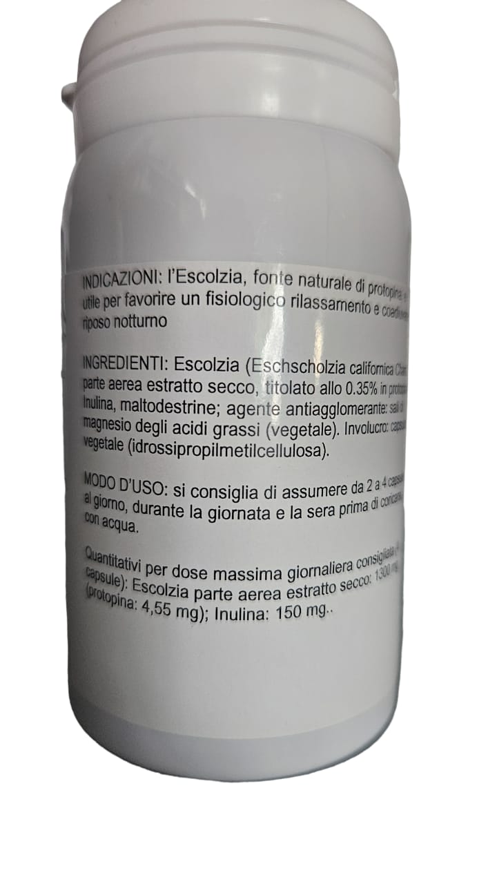 Ingredienti Escolzia (Eschscholzia californica Cham.) parte aerea estratto secco, titolato allo 0.35% in protopina; Inulina, maltodestrine; agente antiagglomerante: sali di magnesio degli acidi grassi (vegetale). Involucro: capsula vegetale (idrossipropilmetilcellulosa).
