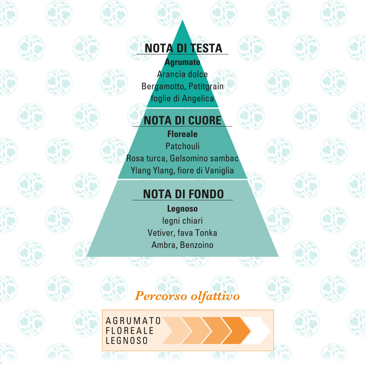 Il bouquet si apre con fresche note esperidate che risvegliano i sensi con scintille di Arancio dolce, Bergamotto e foglie di Petitgrain e Angelica, frizzanti e vivaci, unite a un cuore chiaro e sensuale che svela gli accordi trasparenti del Gelsomino, della Rosa turca e del fiore di YlangYlang.