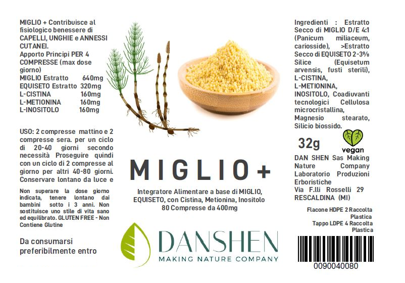 MIGLIO + è un Integratore mirato e specifiamente formulato, a base di ESTRATTI di Miglio ed Equiseto, con Inositolo, L-Cistina e Metionina, che agisce per il benessere e il trofismo ottimale dei capelli e coadiuva il normale trofismo del connettivo di cui fanno parte capelli e unghie.