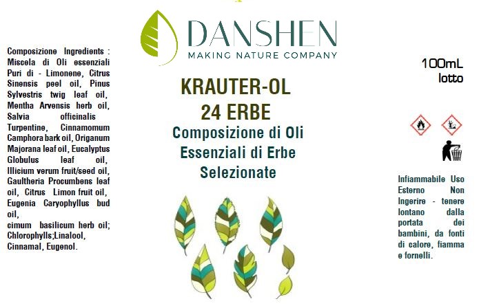 Olio d’erbe da una antica formula tedesca composto da 24 olii essenziali da piante, bacche, radici. 24 Kräuteröl non unge e asciuga subito. E’ un prodotto puro al 100% quindi molto concentrato : pertanto va usato puro soltanto in misura di poche gocce o diluito in olio vettore.