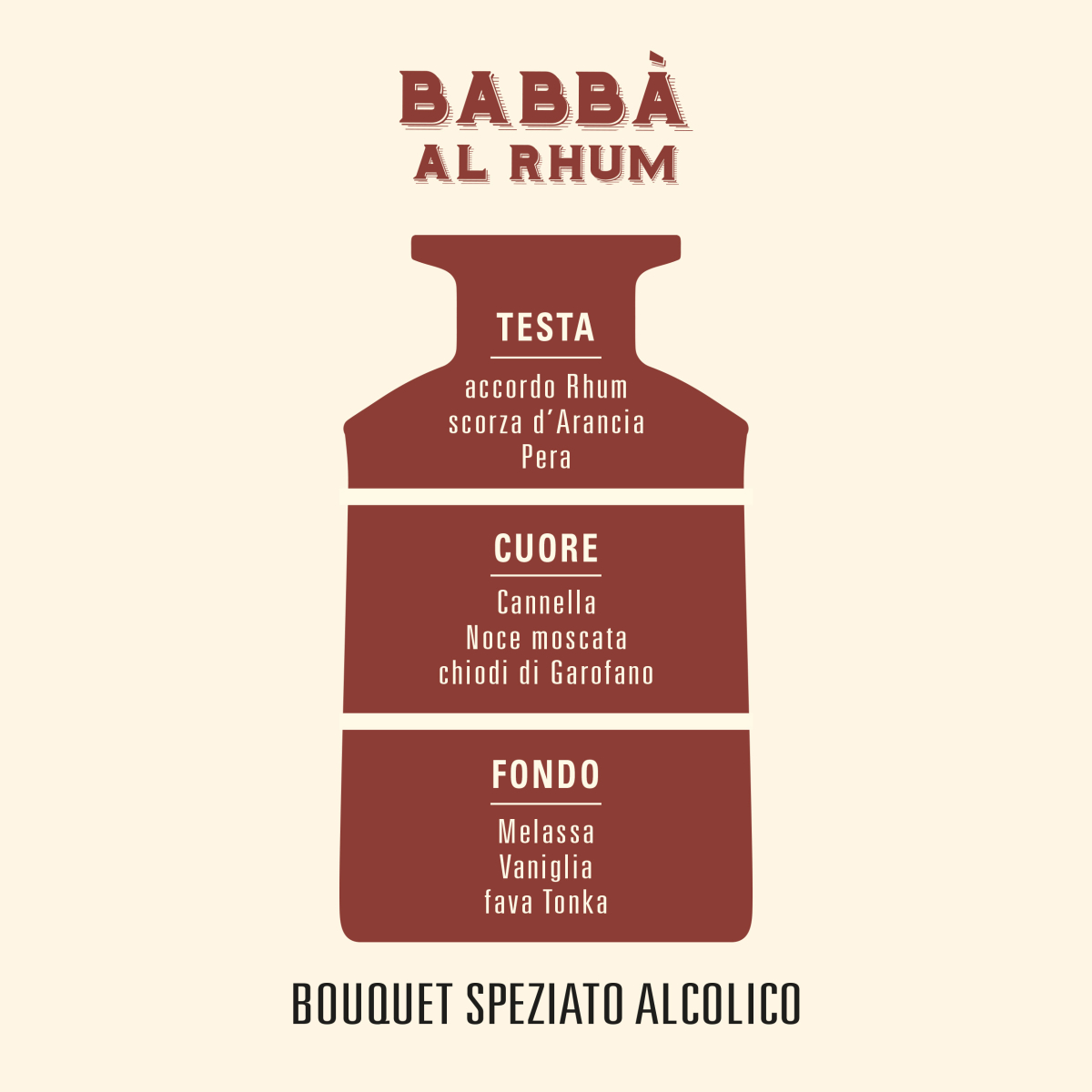 Solo con questa ispirazione si poteva raggiungere un compound così raffinato, carico ma equilibrato, un’evoluzione zuccherina che culmina con una nota speziata tecnica e complessa, sublimata da una componente alcolica che riporta la mente alle origini della pasticceria nel bel paese del sole.