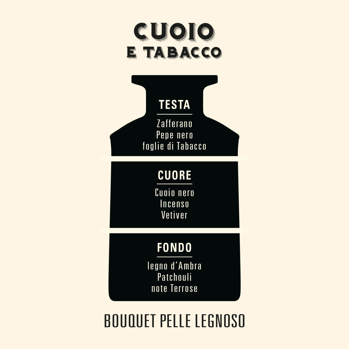Note animaliche e spicy si fondono in un accordo dove predominano le componenti cuoio-pelle e tabacco.