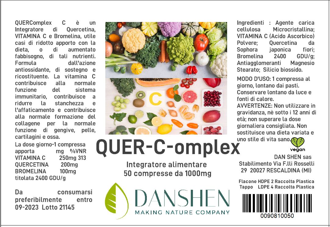 QUERComplex C è un Integratore di Quercitina, VITAMINA C e Bromelina, utile casi di ridotto apporto con la dieta, o di aumentato fabbisogno, di tali nutrienti. Formula dall'azione antiossidante, di sostegno e ricostituente. La vitamina C contribuisce alla normale funzione del sistema immunitario, contribuisce a ridurre la stanchezza e l'affaticamento e contribuisce alla normale formazione del collagene per la normale funzione di gengive, pelle, cartilagini e ossa.