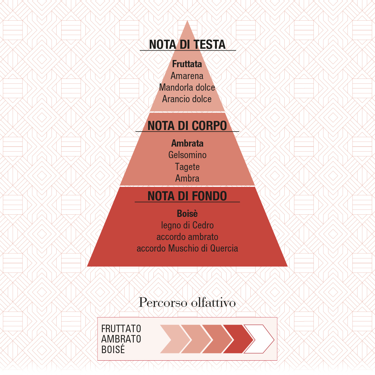 L’aura finale boisè è elegante e persistente, il connubio olfattivo tra il millenario legno di Cedro e la maestosità del legno di Quercia, dal sentore muschiato di sottobosco, conferisce alla scia un fascino ineguagliabile.